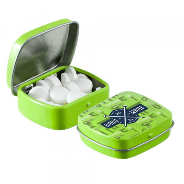 Unsere bekannte Lime grüne Mikroscharnierdose ist mit frischer holländischer Pfefferminze gefüllt, einzeln versiegelt und mit einem ZutatenAufkleber versehen. In verschiedenen Farben erhältlich
