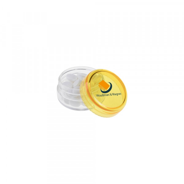 Gelbes Glas mit frischer holländischer Pfefferminze gefüllt und mit einem bedruckten Deckel versehen. Verschiedene Farben erhältlich.