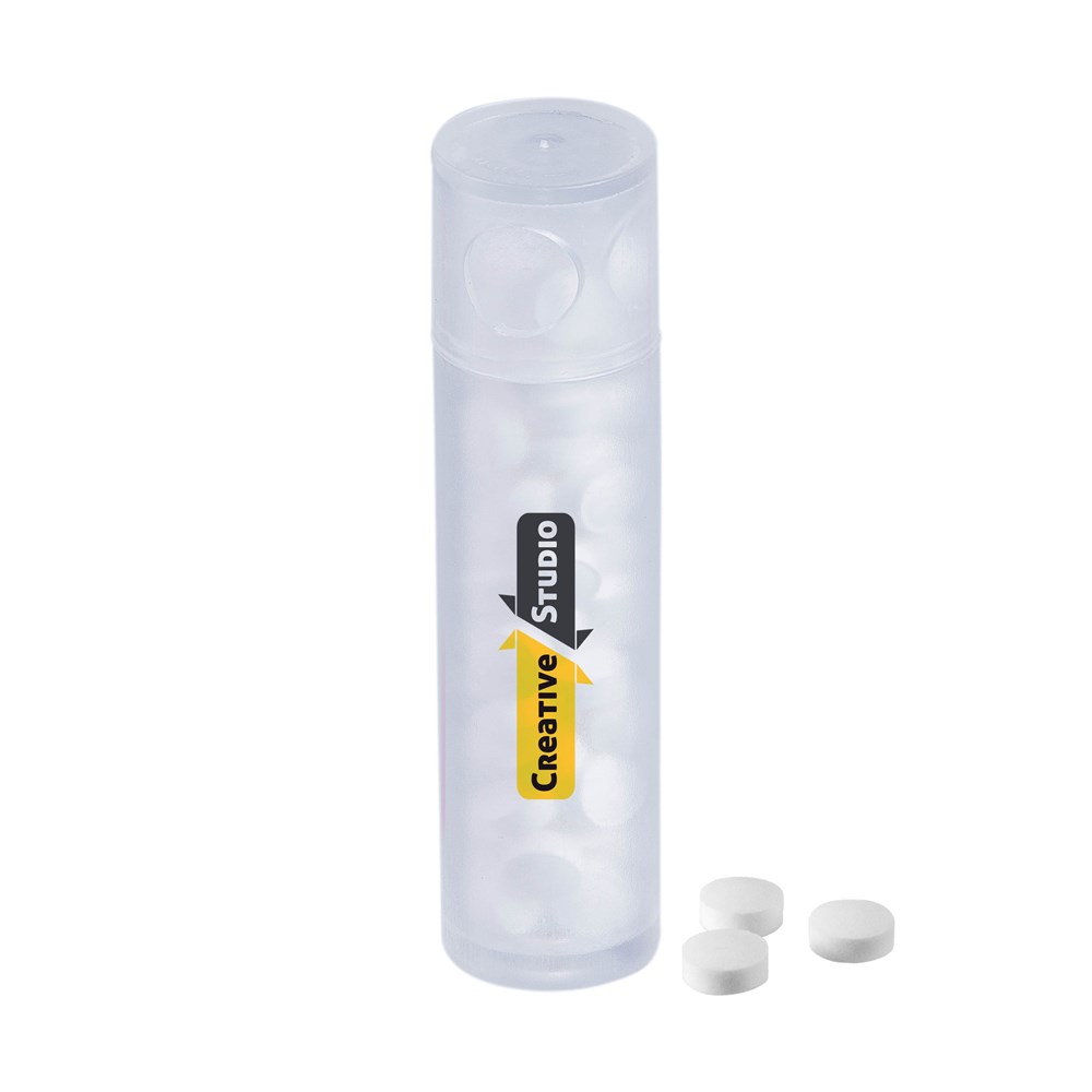 Transparenter Spender gefüllt mit frischen holländischen Minzmünzen mit personalisiertem Aufdruck auf der Vorderseite. Verschiedene Farben erhältlich.