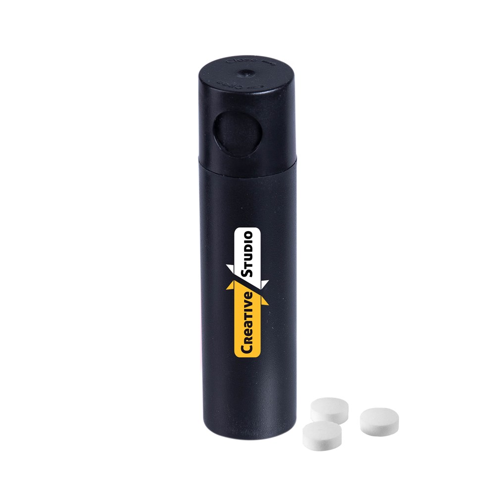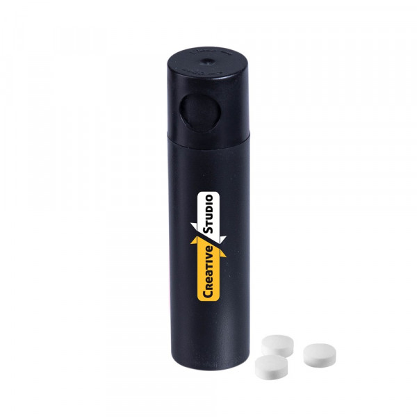 Schwarze Spender gefüllt mit frischen holländischen Minzmünzen mit personalisiertem Aufdruck auf der Vorderseite. Verschiedene Farben erhältlich.