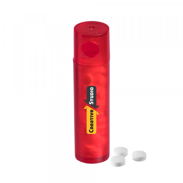 Roter Spender gefüllt mit frischen holländischen Minzmünzen mit personalisiertem Aufdruck auf der Vorderseite. Verschiedene Farben erhältlich.