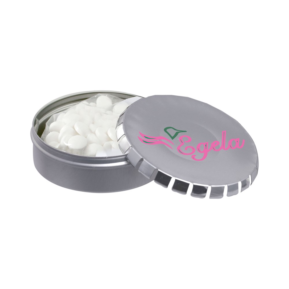 Große silberne Clic-Clac-Dose, gefüllt mit frischer holländischer Pfefferminze, versiegelt pro Stück und mit einem ZutatenAufkleber versehen. Auch in weiß erhältlich.