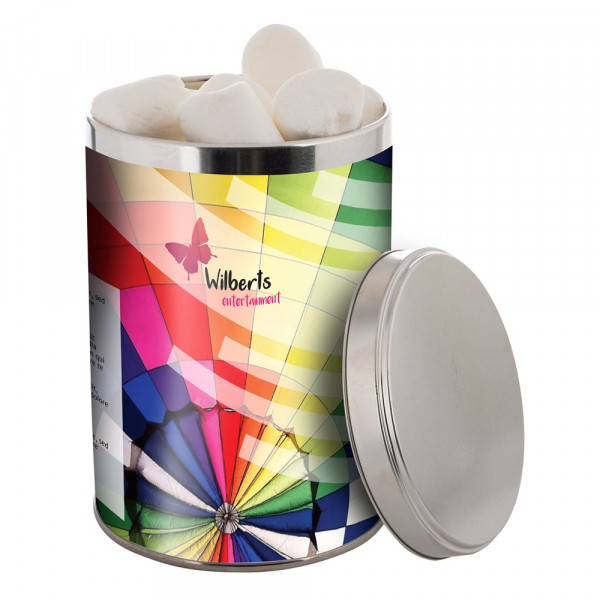 Große silberne Dose, gefüllt mit köstlichen Süßigkeiten und mit einer vollfarbig bedruckten Hülle versehen. Verschiedene Füllungen möglich.