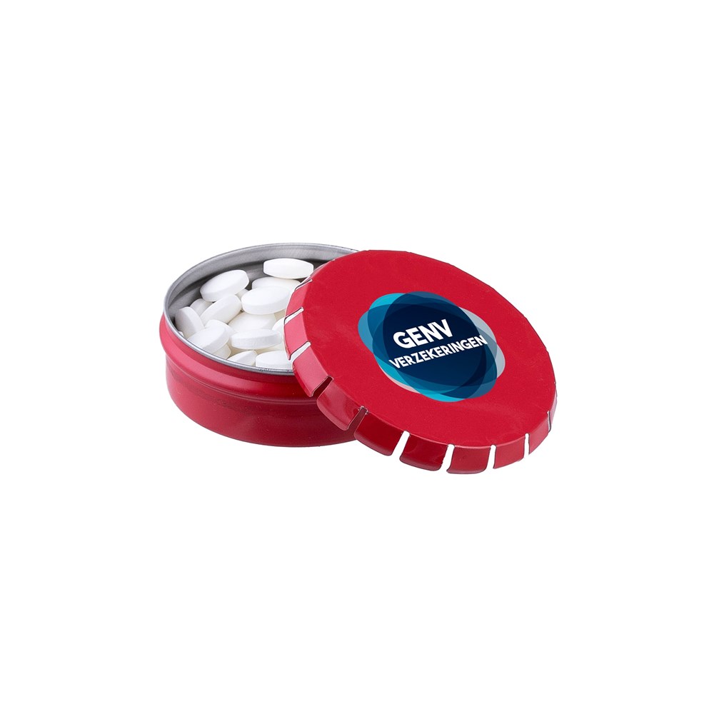 Die Cassische rote Mini-Clic-Clac-Dose ist mit frischer holländischer Pfefferminze gefüllt, einzeln versiegelt und mit einem ZutatenAufkleber versehen. In verschiedenen Farben erhältlich.