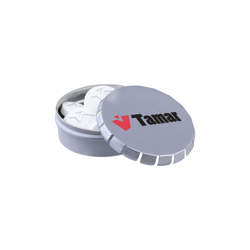Benötigen Sie eine einzigartige Pfefferminze in Ihrer eigenen Form oder mit Ihrem Logo? Dann bestellen Sie unsere Cassische graue Mini-Clic-Dose mit frischer holländischer Pfefferminze, einzeln versiegelt und mit einem ZutatenAufkleber. In verschiedenen Farben erhältlich.