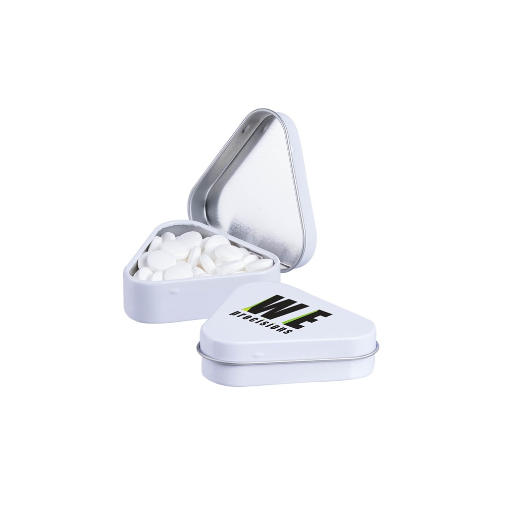 Dreiecksdose gefüllt mit frischer holländischer Pfefferminze, einzeln versiegelt und mit einem ZutatenAufkleber. Auch in silber erhältlich