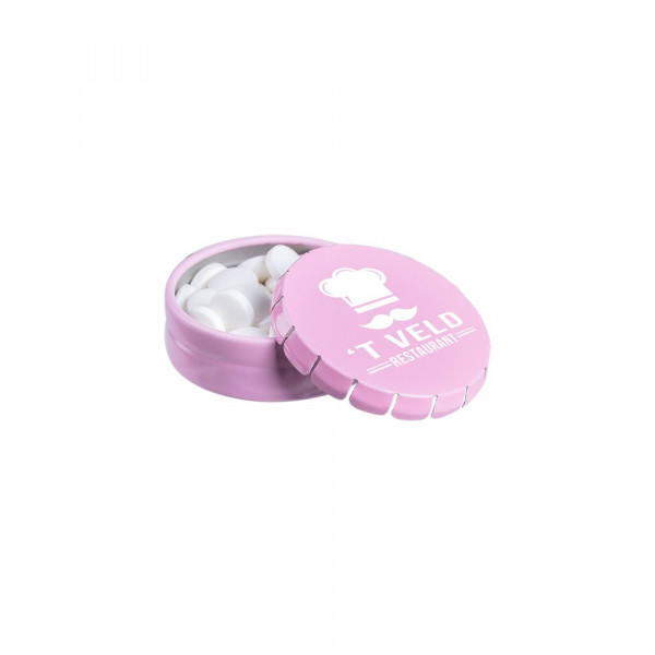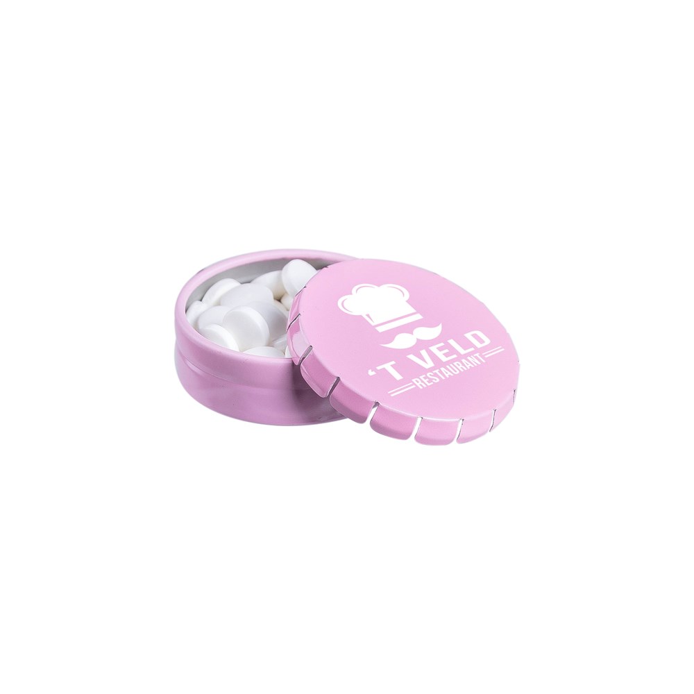 Die Cassische rosa Super Mini Clic Clac Dose ist mit frischer holländischer Pfefferminze gefüllt, einzeln versiegelt und mit einem ZutatenAufkleber versehen. In verschiedenen Farben erhältlich.
