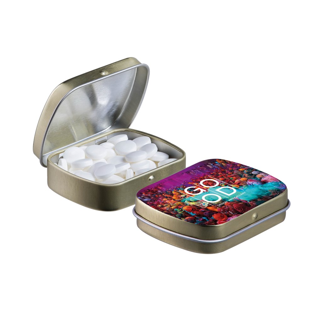 Unsere bekannte Goldfarbenen Mini-Scharnierdose mit einer Prägung auf dem Deckel und gefüllt mit frischer holländischer Pfefferminze, einzeln versiegelt und mit einem ZutatenAufkleber, in verschiedenen Farben erhältich