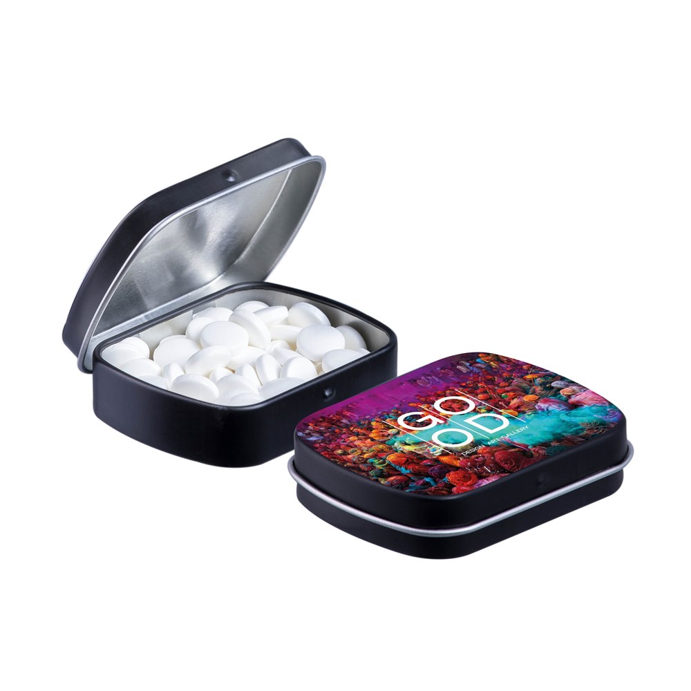 Unsere bekannte matt schwarze Mini-Scharnierdose gefüllt mit frischer holländischer Pfefferminze, einzeln versiegelt und mit einem ZutatenAufkleber. In verschiedenen Farben erhältlich.