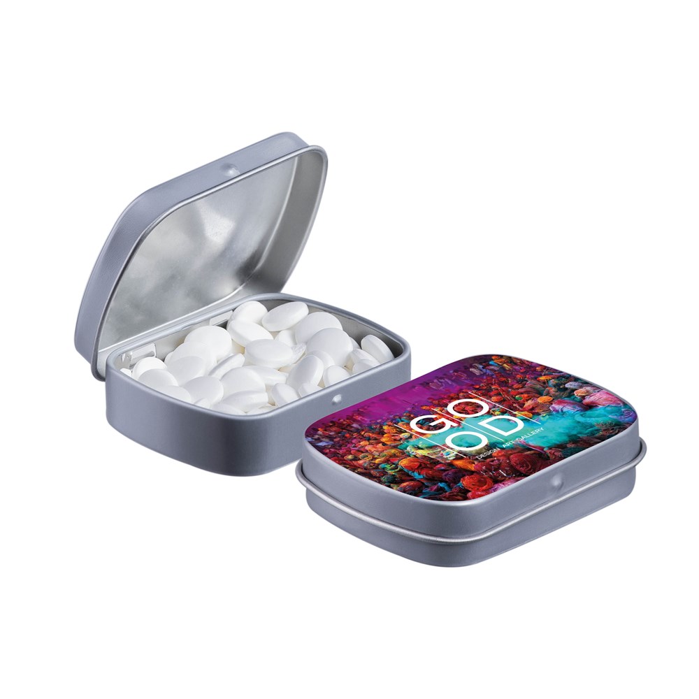 Unsere bekannte graufarbenen Mini-Scharnierdose mit einer Prägung auf dem Deckel und gefüllt mit frischer holländischer Pfefferminze, einzeln versiegelt und mit einem ZutatenAufkleber, in verschiedenen Farben erhältich