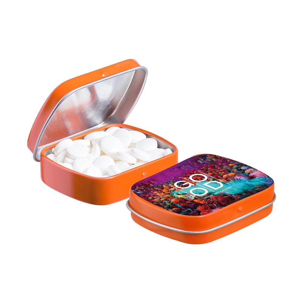 Unsere bekannte orange Mini-Scharnierdose gefüllt mit frischer holländischer Pfefferminze, einzeln versiegelt und mit einem ZutatenAufkleber. In verschiedenen Farben erhältlich.
