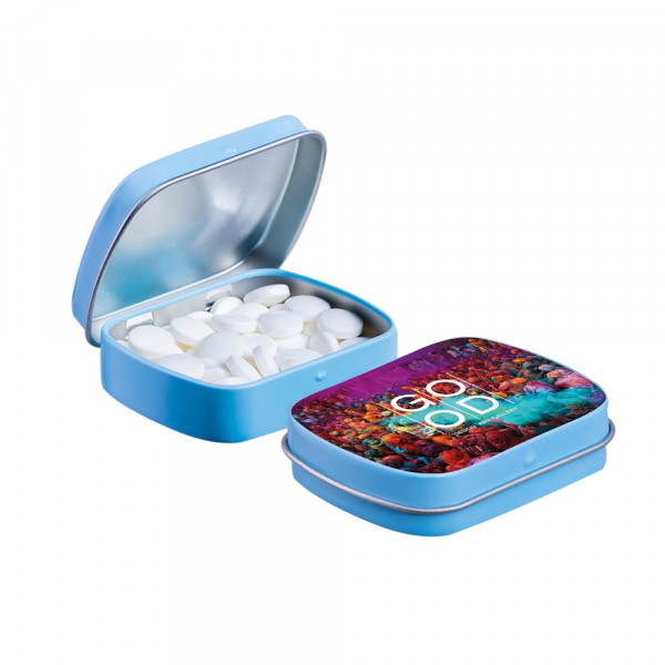 Unsere bekannte hellblaufarbenen Mini-Scharnierdose mit einer Prägung auf dem Deckel und gefüllt mit frischer holländischer Pfefferminze, einzeln versiegelt und mit einem ZutatenAufkleber, in verschiedenen Farben erhältich