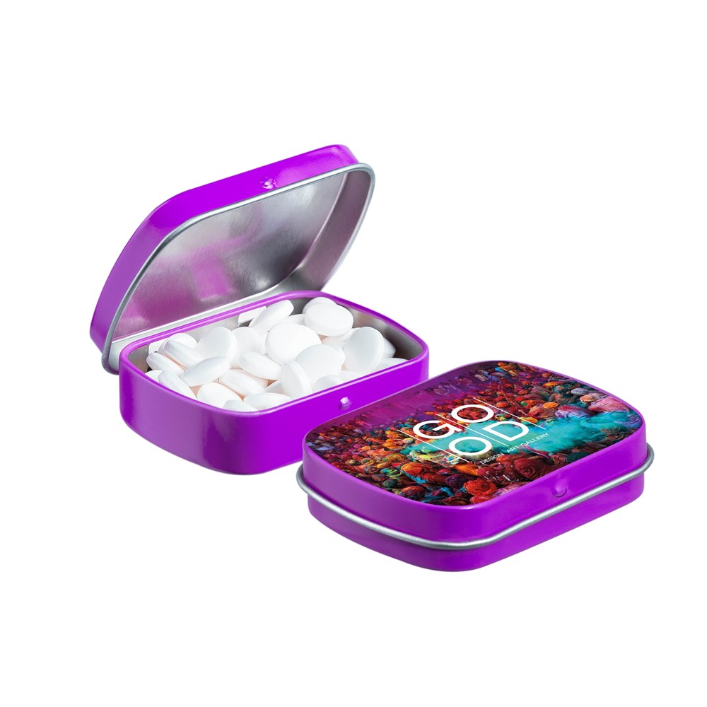 Unsere bekannte fuchsiafarbenen Mini-Scharnierdose mit einer Prägung auf dem Deckel und gefüllt mit frischer holländischer Pfefferminze, einzeln versiegelt und mit einem ZutatenAufkleber, in verschiedenen Farben erhältich