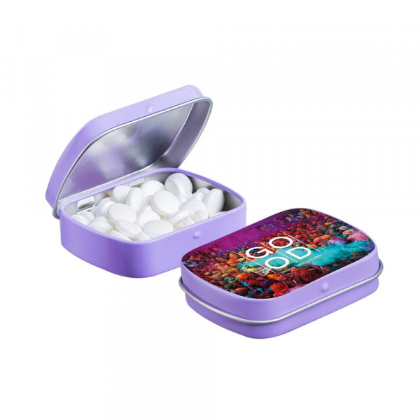 Unsere bekannte lilafarbenen Mini-Scharnierdose mit einer Prägung auf dem Deckel und gefüllt mit frischer holländischer Pfefferminze, einzeln versiegelt und mit einem ZutatenAufkleber, in verschiedenen Farben erhältich