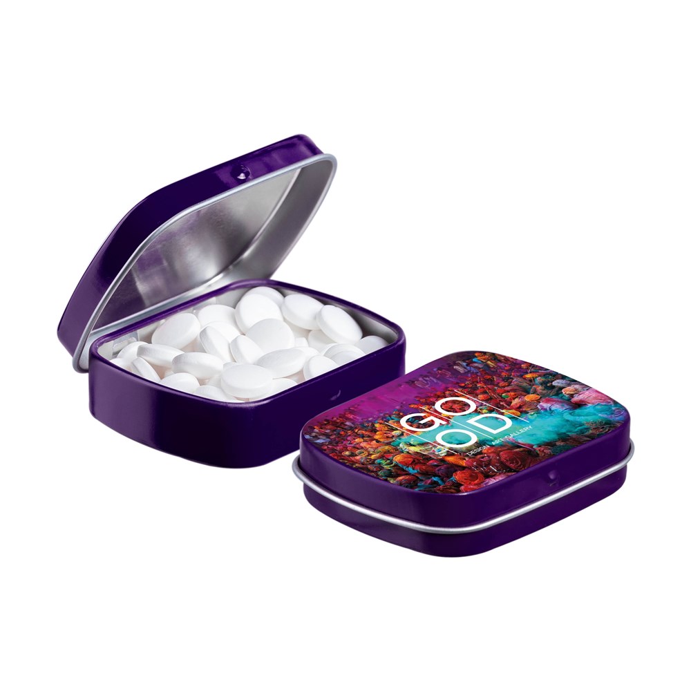 Unsere bekannte violett Mini-Scharnierdose gefüllt mit frischer holländischer Pfefferminze, einzeln versiegelt und mit einem ZutatenAufkleber. In verschiedenen Farben erhältlich.