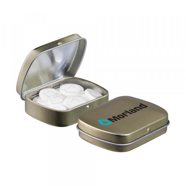 Benötigen Sie eine einzigartige Pfefferminze in Ihrer eigenem Form oder mit Ihrem Logo? Dann bestellen Sie unsere Goldene Minischarnierdose mit Pfefferminze mit Logo / Form und zeichnen Sie sich durch ein einzigartiges Werbegeschenk aus. Die Dose ist mit einem Siegel und einem ZutatenAufkleber versehen und in verschiedenen Farben erhältlich