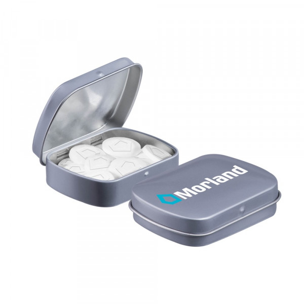 Benötigen Sie eine einzigartige Pfefferminze in Ihrer eigenem Form oder mit Ihrem Logo? Dann bestellen Sie unsere graue Minischarnierdose mit Pfefferminze mit Logo / Form und zeichnen Sie sich durch ein einzigartiges Werbegeschenk aus. Die Dose ist mit einem Siegel und einem ZutatenAufkleber versehen und in verschiedenen Farben erhältlich