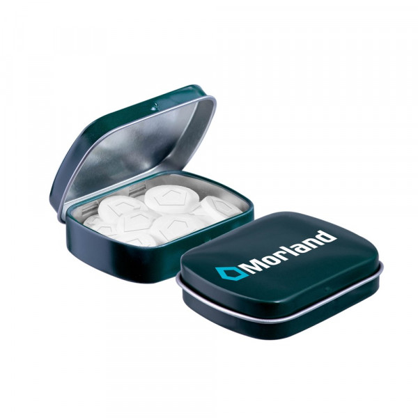 Benötigen Sie eine einzigartige Pfefferminze in Ihrer eigenem Form oder mit Ihrem Logo? Dann bestellen Sie unsere dunkegrüne Minischarnierdose mit Pfefferminze mit Logo / Form und zeichnen Sie sich durch ein einzigartiges Werbegeschenk aus. Die Dose ist mit einem Siegel und einem ZutatenAufkleber versehen und in verschiedenen Farben erhältlich