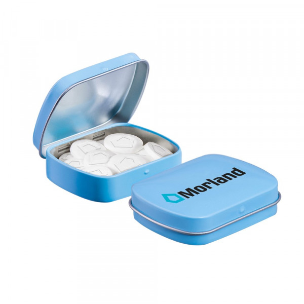 Benötigen Sie eine einzigartige Pfefferminze in Ihrer eigenem Form oder mit Ihrem Logo? Dann bestellen Sie unsere hellblaue Minischarnierdose mit Pfefferminze mit Logo / Form und zeichnen Sie sich durch ein einzigartiges Werbegeschenk aus. Die Dose ist mit einem Siegel und einem ZutatenAufkleber versehen und in verschiedenen Farben erhältlich