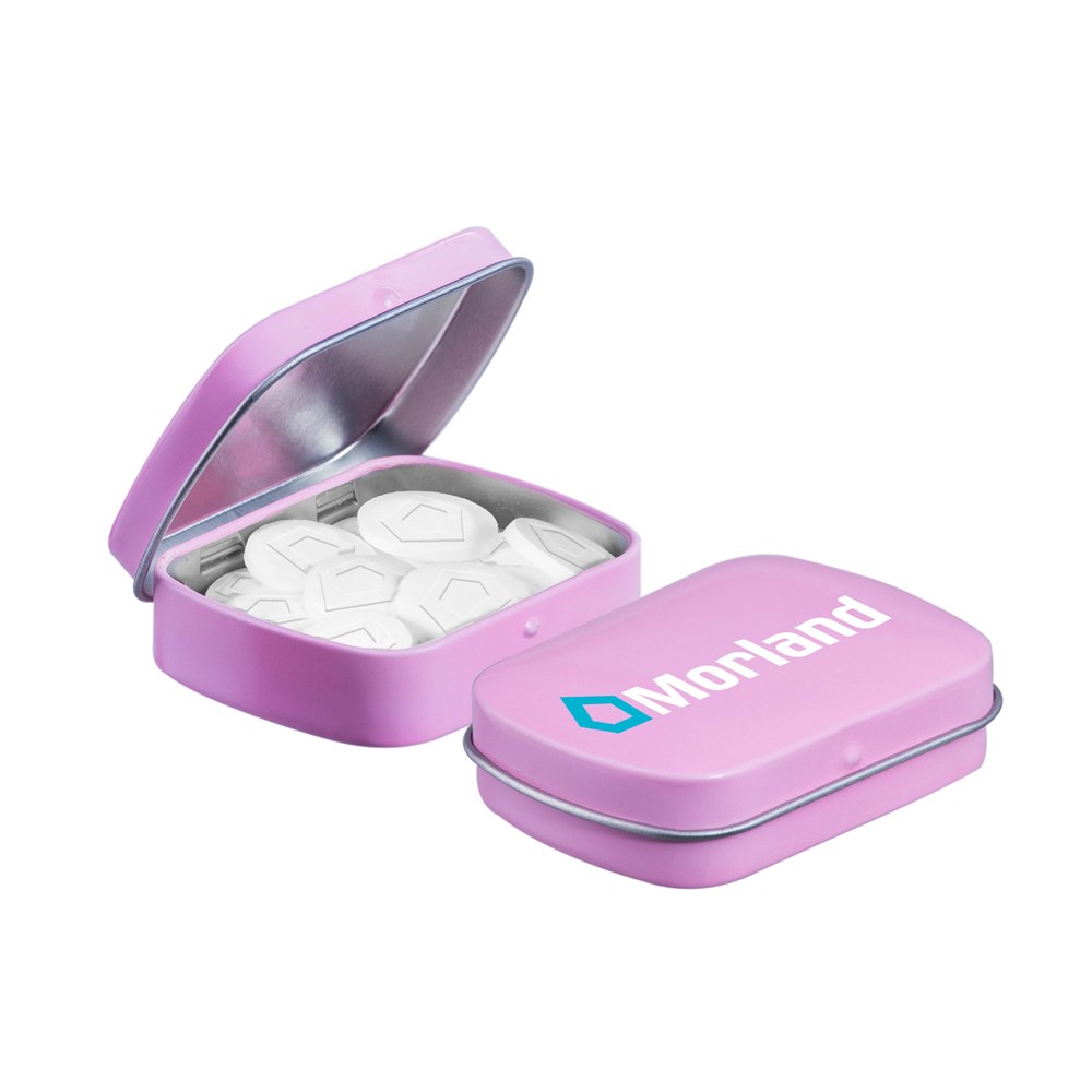 Benötigen Sie eine einzigartige Pfefferminze in Ihrer eigenem Form oder mit Ihrem Logo? Dann bestellen Sie unsere rosa Minischarnierdose mit Pfefferminze mit Logo / Form und zeichnen Sie sich durch ein einzigartiges Werbegeschenk aus. Die Dose ist mit einem Siegel und einem ZutatenAufkleber versehen und in verschiedenen Farben erhältlich