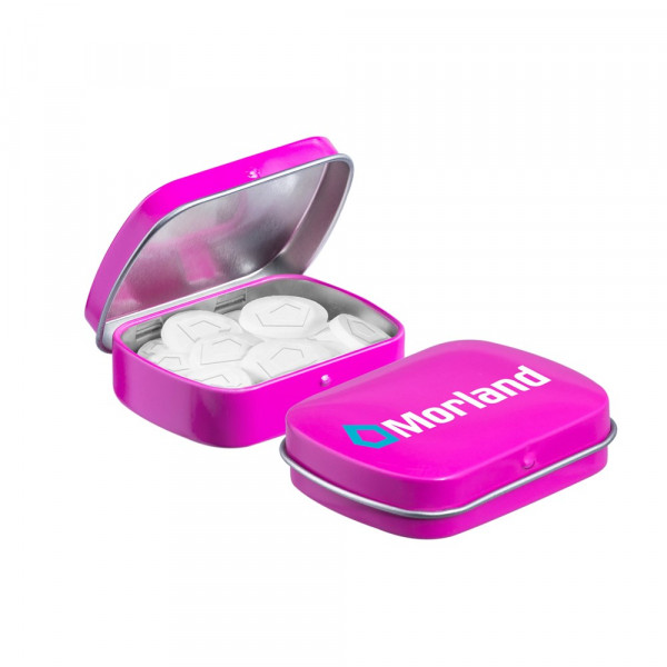 Benötigen Sie eine einzigartige Pfefferminze in Ihrer eigenem Form oder mit Ihrem Logo? Dann bestellen Sie unsere pink Minischarnierdose mit Pfefferminze mit Logo / Form und zeichnen Sie sich durch ein einzigartiges Werbegeschenk aus. Die Dose ist mit einem Siegel und einem ZutatenAufkleber versehen und in verschiedenen Farben erhältlich