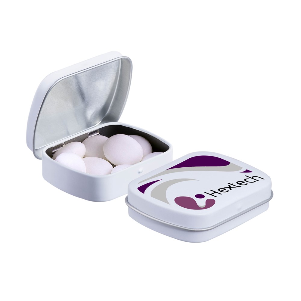 Unsere bekannte weisse Mini-Scharnierdose gefüllt mit Mentos Mints, einzeln versiegelt und mit einem ZutatenAufkleber. In verschiedenen Farben erhältlich.