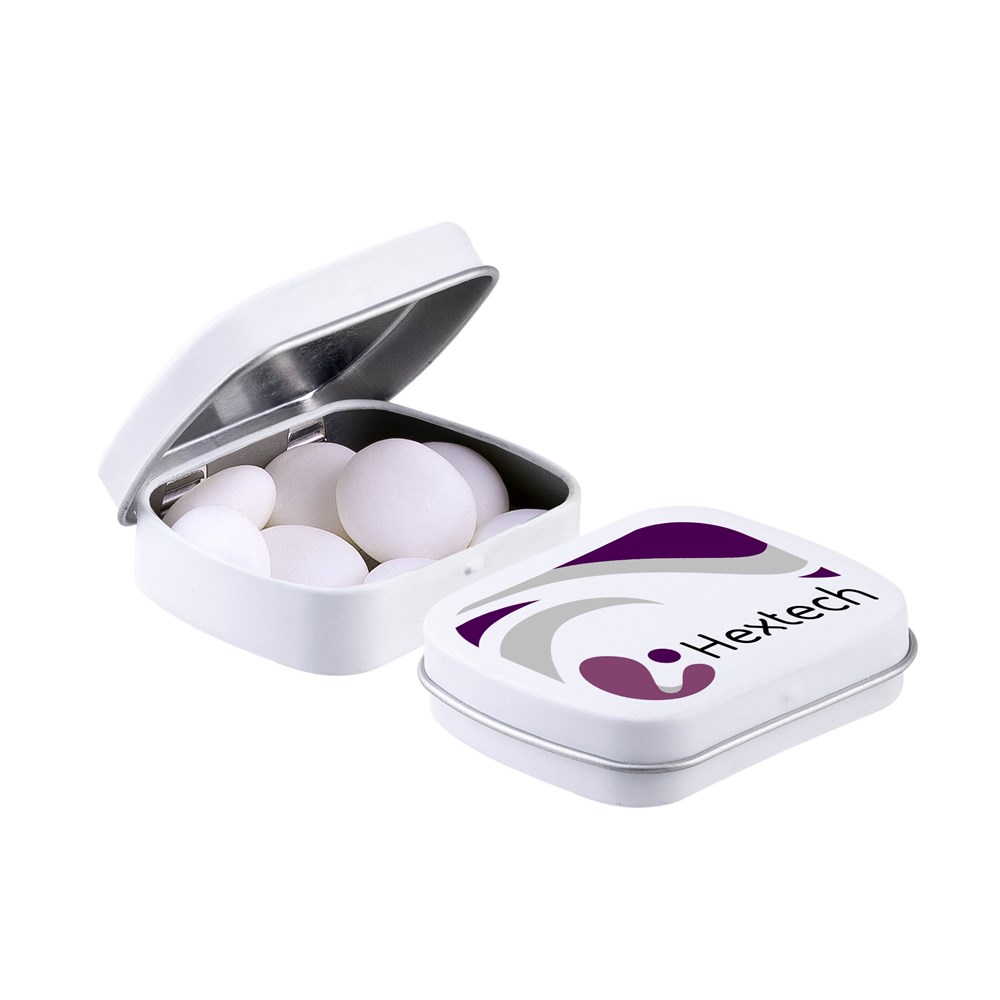 Unsere bekannte matt weisse Mini-Scharnierdose gefüllt mit Mentos Mints, einzeln versiegelt und mit einem ZutatenAufkleber. In verschiedenen Farben erhältlich.