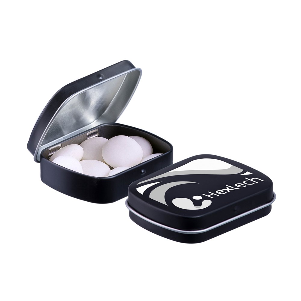 Unsere bekannte matt schwarze Mini-Scharnierdose gefüllt mit Mentos Mints, einzeln versiegelt und mit einem ZutatenAufkleber. In verschiedenen Farben erhältlich.