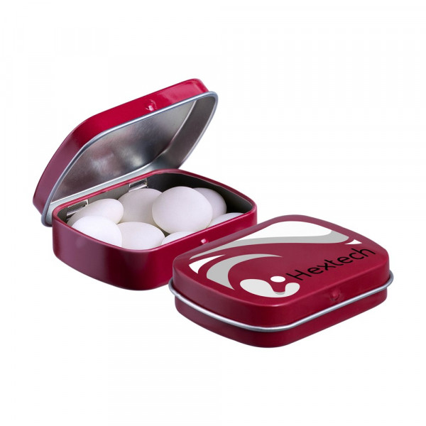 Unsere bekannte wein rote Mini-Scharnierdose gefüllt mit Mentos Mints, einzeln versiegelt und mit einem ZutatenAufkleber. In verschiedenen Farben erhältlich.