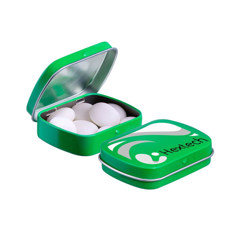 Unsere bekannte grüne Mini-Scharnierdose gefüllt mit Mentos Mints, einzeln versiegelt und mit einem ZutatenAufkleber. In verschiedenen Farben erhältlich.