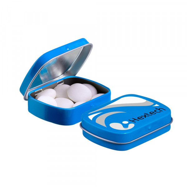 Unsere bekannte kobalt blaue Mini-Scharnierdose gefüllt mit Mentos Mints, einzeln versiegelt und mit einem ZutatenAufkleber. In verschiedenen Farben erhältlich.