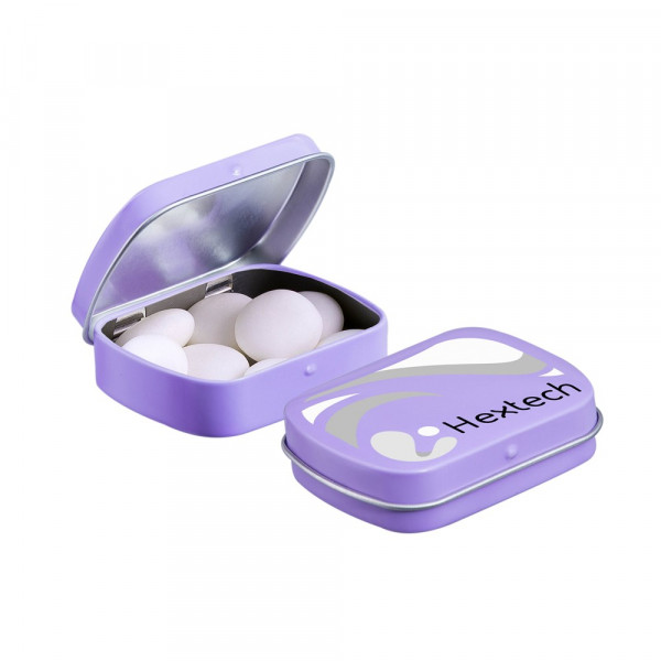 Unsere bekannte lila Mini-Scharnierdose gefüllt mit Mentos Mints, einzeln versiegelt und mit einem ZutatenAufkleber. In verschiedenen Farben erhältlich.