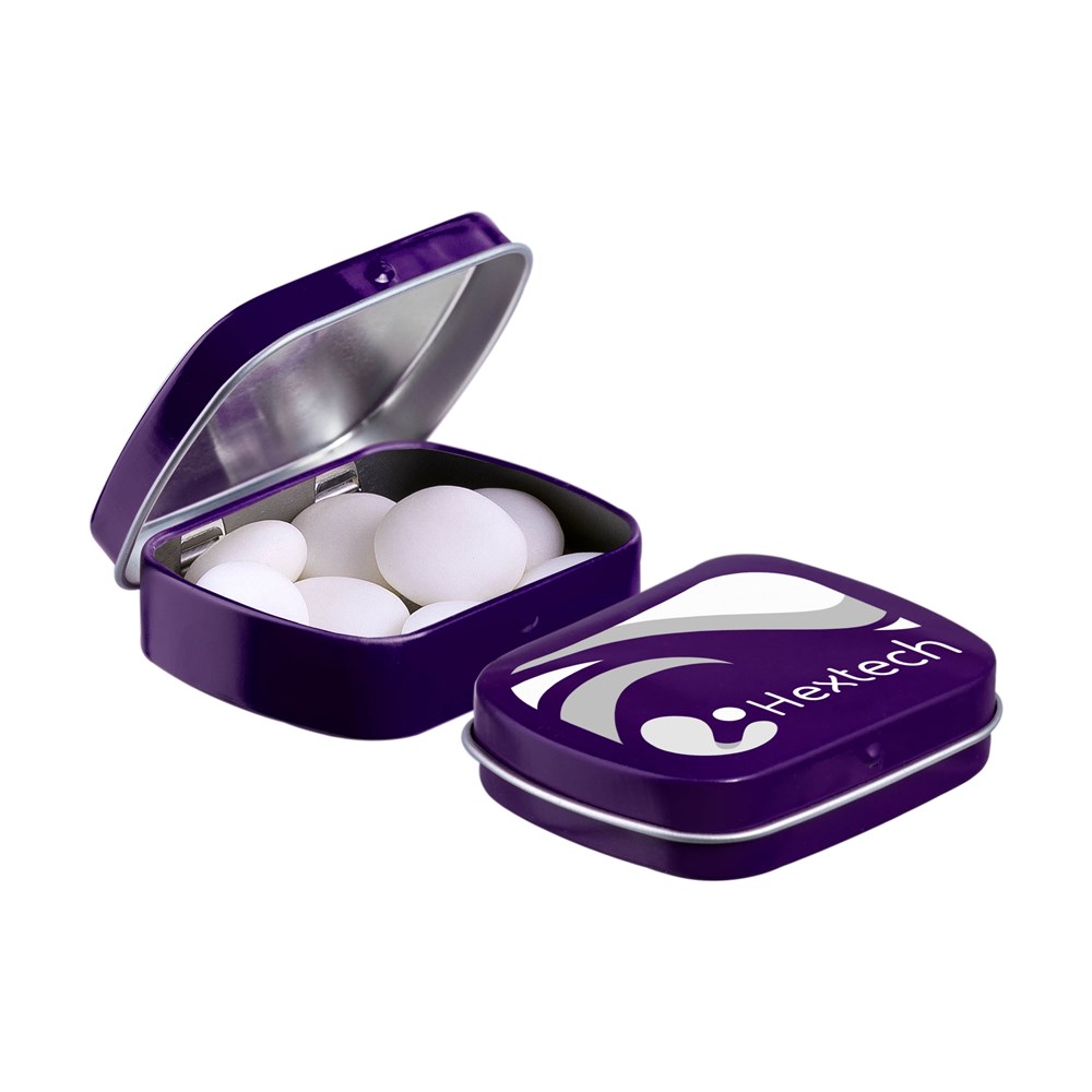 Unsere bekannte violett Mini-Scharnierdose gefüllt mit Mentos Mints, einzeln versiegelt und mit einem ZutatenAufkleber. In verschiedenen Farben erhältlich.