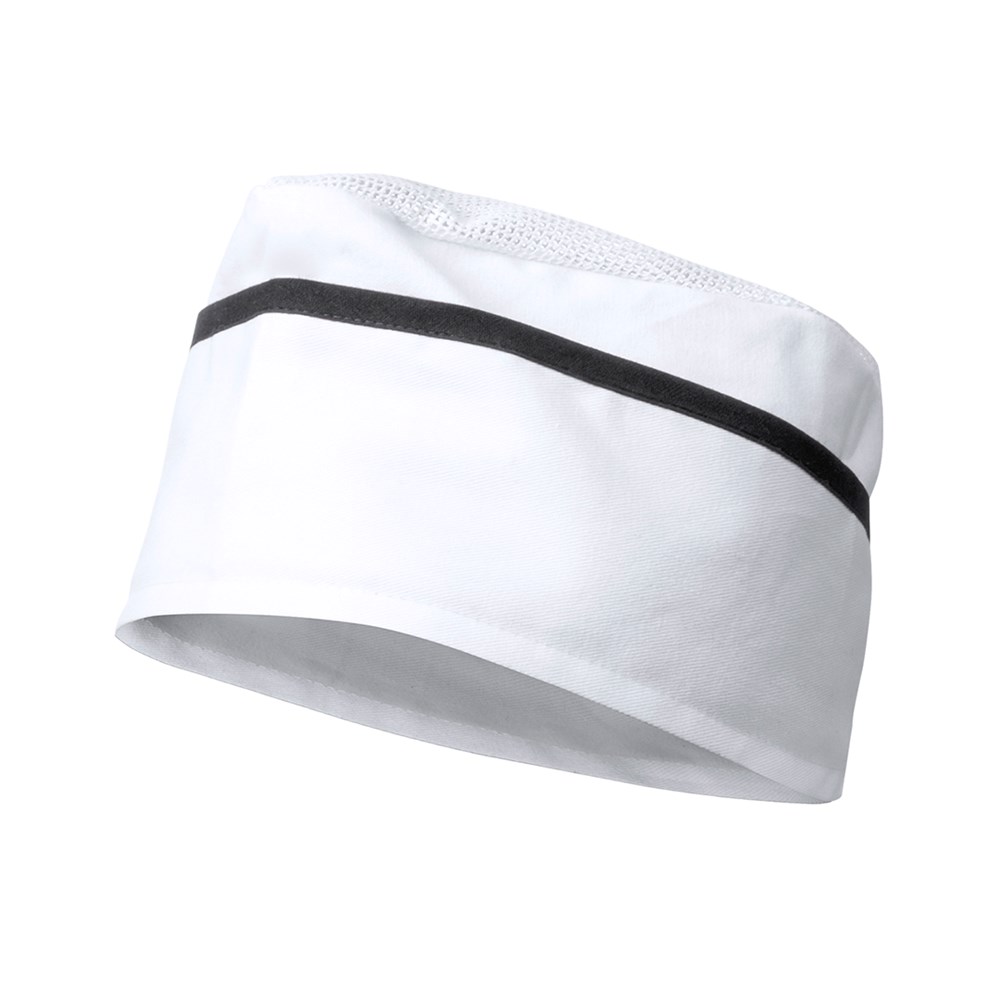 Kochmütze aus angenehmem TC-Material - einer Baumwoll/Polyester-Kombination - in einer fröhlichen Farbkombination: Weiß mit Kontrastdetails in lebendigen Farben.