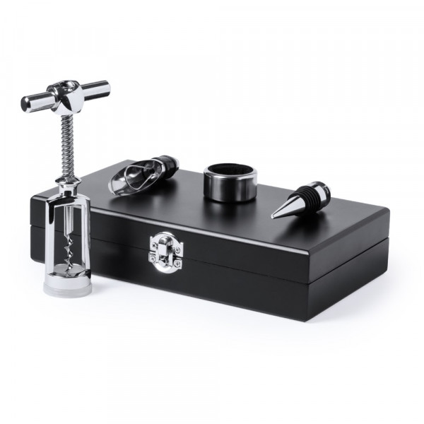 Wein-Set von Antonio Miró aus Dosierkappe, Korkenzieher, Tropfring und Weinstopper. Präsentiert in einer eleganten Holzkiste mit Metallverschluss und Interieur mit Stanzung.