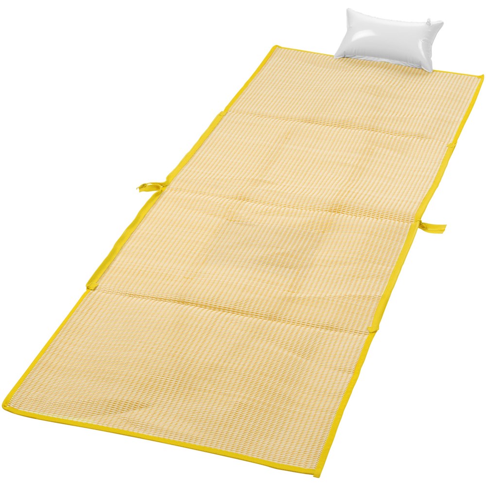 2-in-1-Strandmatte, die zu einer praktischen Tragetasche in der Größe 60 x 44 cm zusammengefaltet werden kann. Mit einer Tasche und einem aufblasbaren Kissen. Tragegriffhöhe 28 cm.