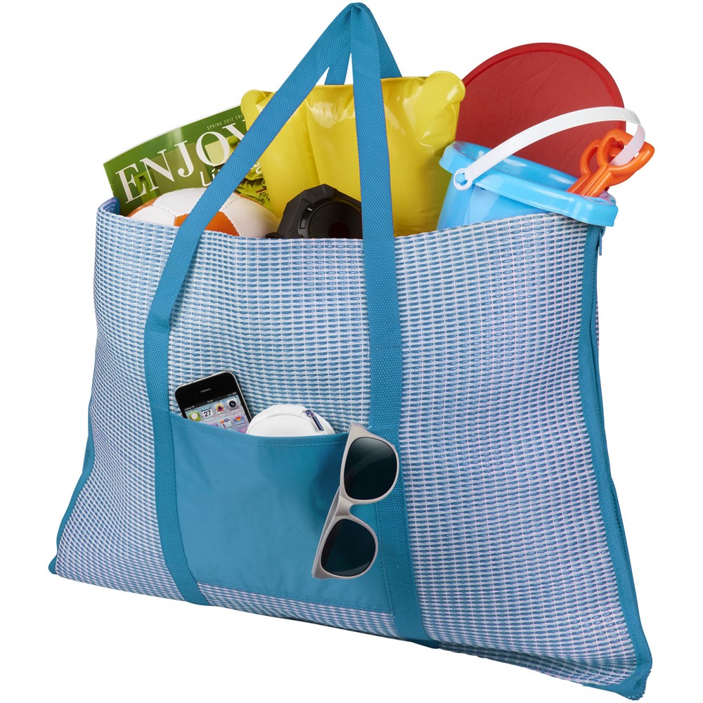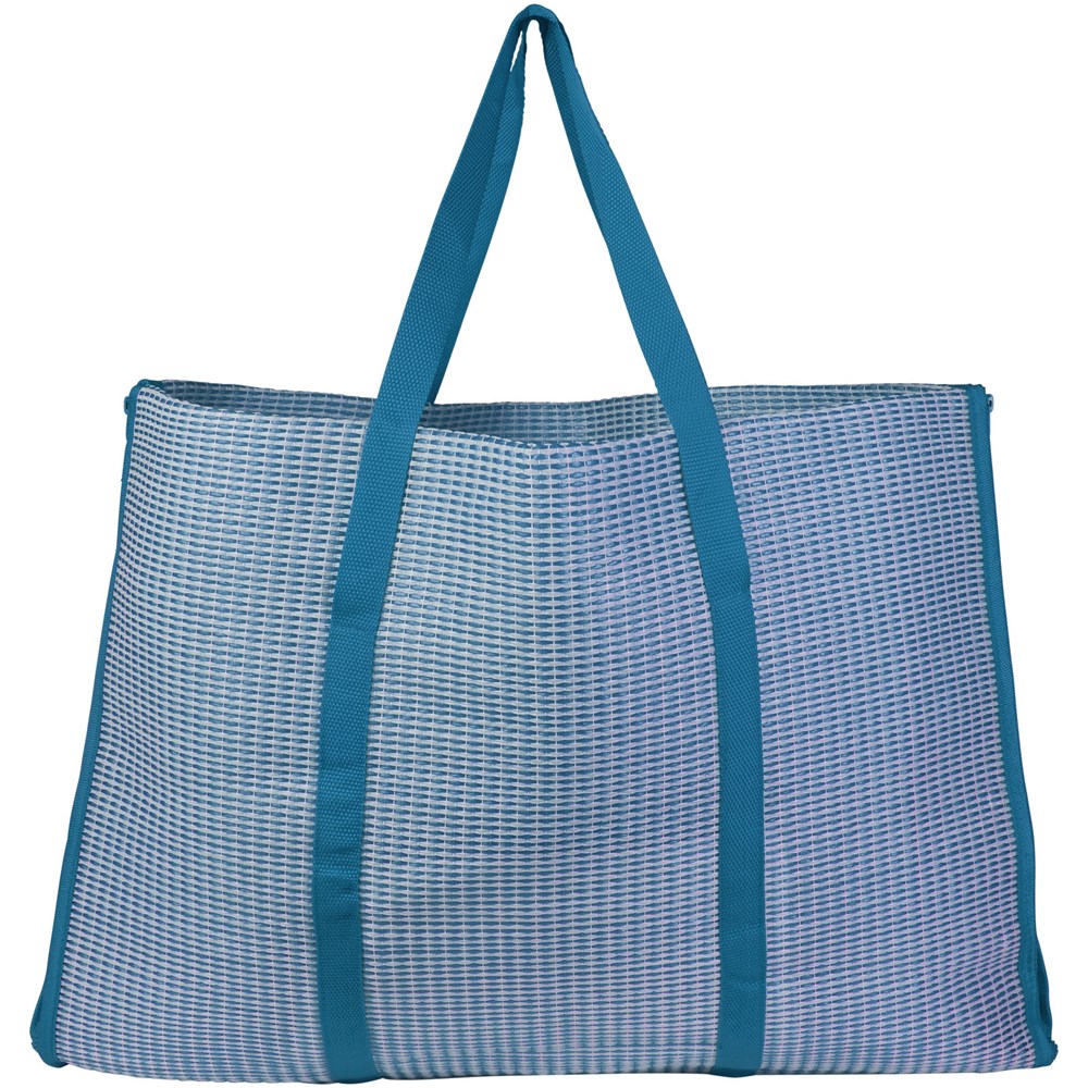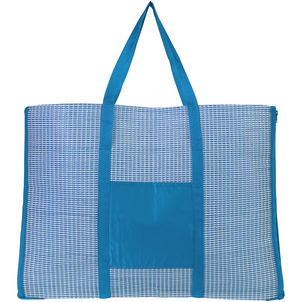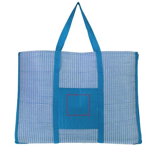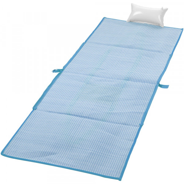 2-in-1-Strandmatte, die zu einer praktischen Tragetasche in der Größe 60 x 44 cm zusammengefaltet werden kann. Mit einer Tasche und einem aufblasbaren Kissen. Tragegriffhöhe 28 cm.