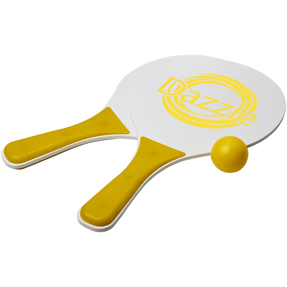 Immer Spaß mit diesem Strandspiel-Set, das in einer Vielzahl von Farben angeboten wird. Dieses strapazierfähige Strandspiel-Set ist aus MDF-Holz mit farbigem PP-Griff gefertigt. Zusammen mit einem weichen Ball in gleicher Farbe in einer Netzpackung für einfachen Transport zu einem lustigen Strandtag verpackt.