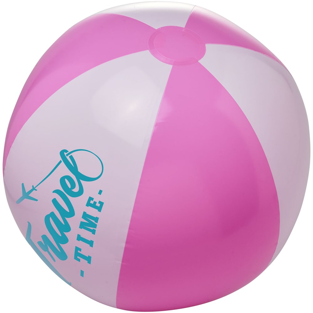 Zweifarbiger, aufblasbarer Wasserball. Im aufgeblasenen Zustand hat der Wasserball einen Durchmesser von ca. 40 cm, im unbefüllten Zustand sind es ca. 52 cm. Der erforderliche Warnhinweis ist um das Sicherheitsventil herum aufgedruckt. Große Werbeanbringungsfläche auf den Segmenten für maximale Sichtbarkeit des Logos. Entspricht EN-71, REACH und POP.