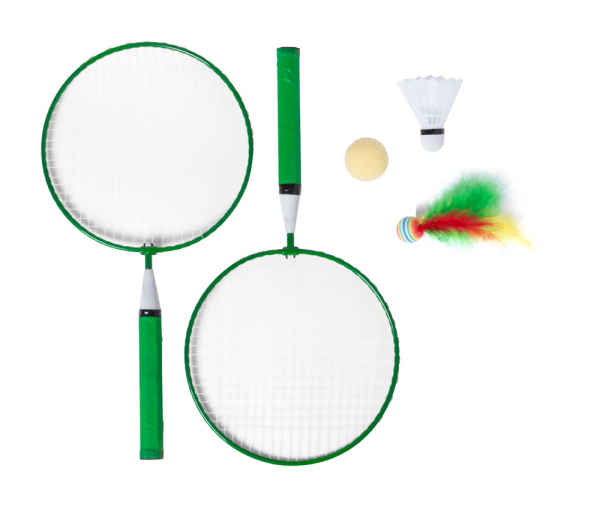 Badmintonset für 2 Spieler: 2 Schläger und 3 Bälle. Material: Metall und Holz.