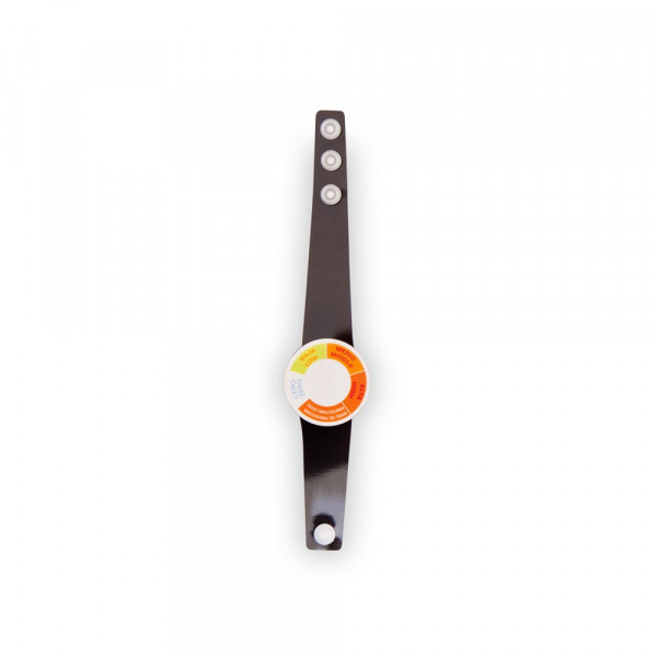 Verstellbares Armband mit UV-Strahlungsmesser in verschiedenen kräftigen Farben. Mit Druckknopfverschluss.