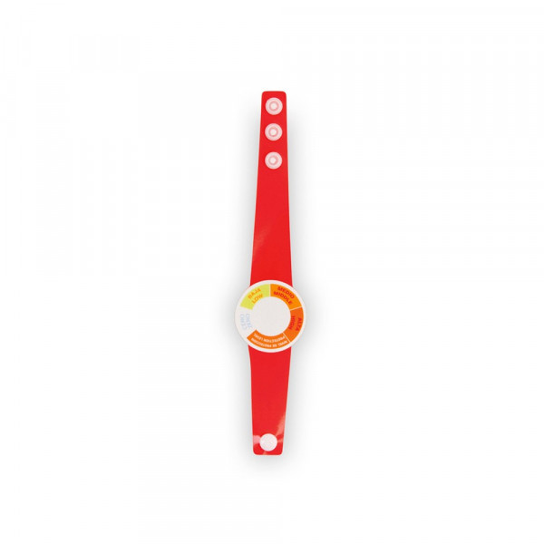 Verstellbares Armband mit UV-Strahlungsmesser in verschiedenen kräftigen Farben. Mit Druckknopfverschluss.