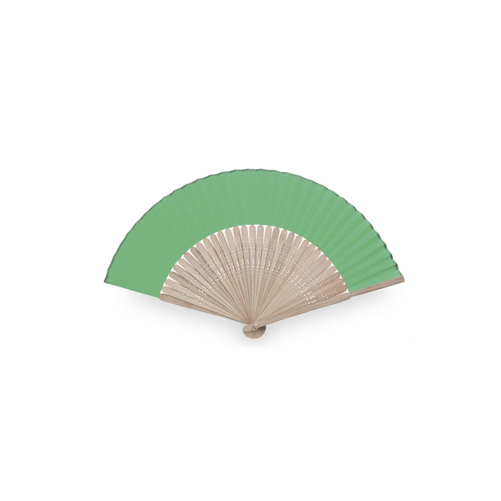 Handfächer aus gestanzten Holzstäbchen und Polyestergewebe in verschiedenen Farben. Präsentiert... mehr