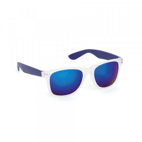 Sonnenbrille mit UV-400-Schutz mit klassischem Design. Mit halbtransparentem Rahmen, Bügeln in fröhlichen Farben und farblich passenden, verspiegelten Gläsern.