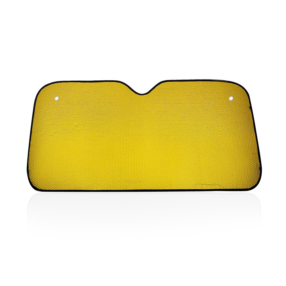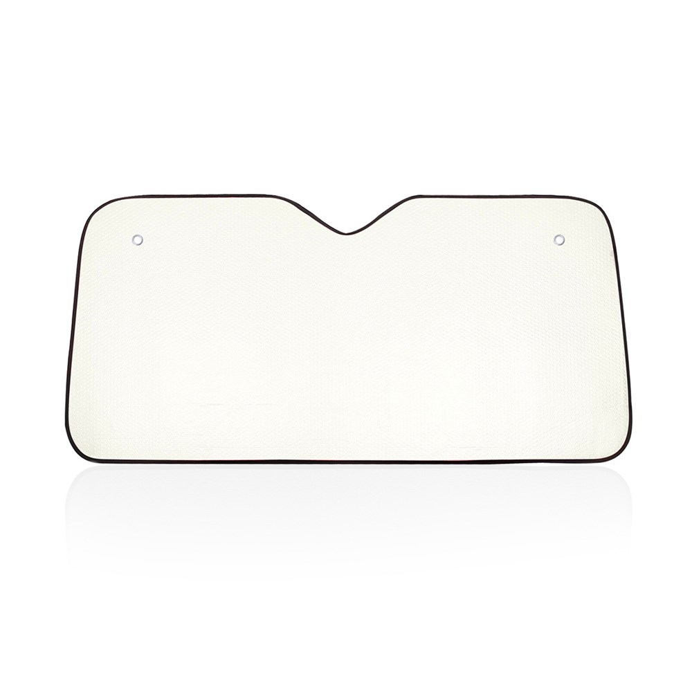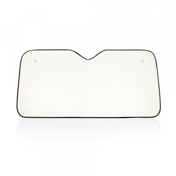 Sonnenschutz aus Aluminum in einer Vielzahl von kräftigen Metallic-Farben. Mit den Maßen 130 x 60 cm, Metallösen zur Verstärkung, sowie zwei Saugnäpfen für die Befestigung an der Windschutzscheibe. Präsentiert in ungefaltetem Zustand für einfaches Bedrucken.