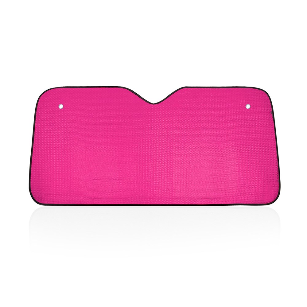 Sonnenschutz aus Aluminum in einer Vielzahl von kräftigen Metallic-Farben. Mit den Maßen 130 x 60 cm, Metallösen zur Verstärkung, sowie zwei Saugnäpfen für die Befestigung an der Windschutzscheibe. Präsentiert in ungefaltetem Zustand für einfaches Bedrucken.
