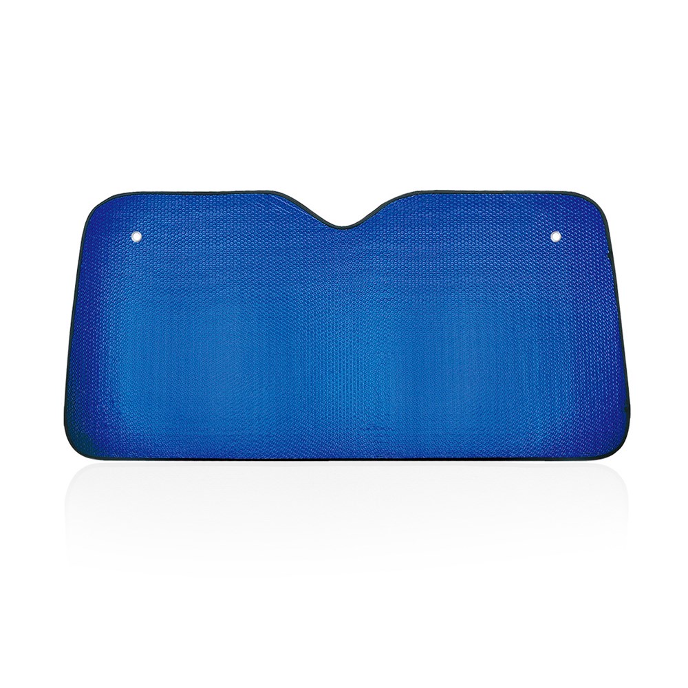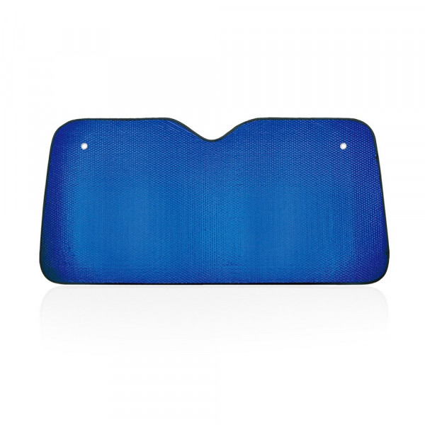 Sonnenschutz aus Aluminum in einer Vielzahl von kräftigen Metallic-Farben. Mit den Maßen 130 x 60 cm, Metallösen zur Verstärkung, sowie zwei Saugnäpfen für die Befestigung an der Windschutzscheibe. Präsentiert in ungefaltetem Zustand für einfaches Bedrucken.