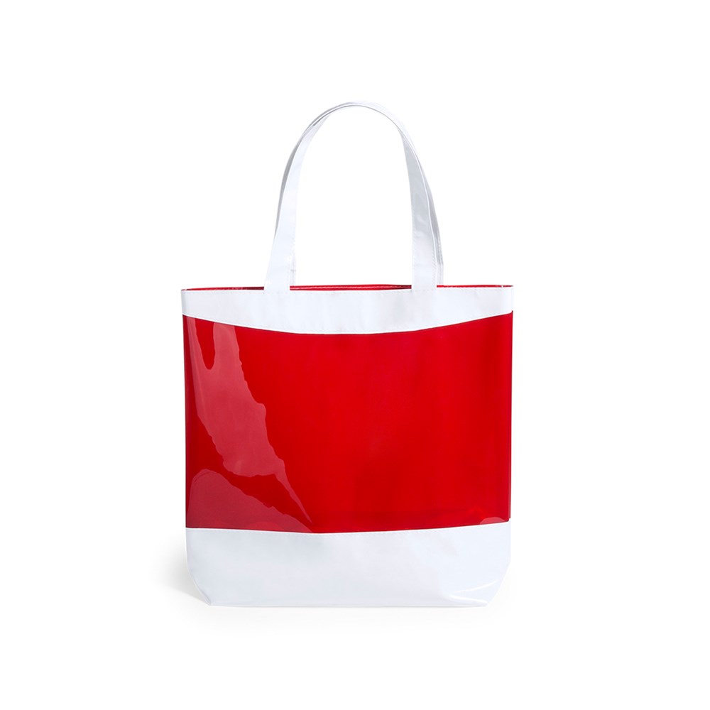Originelle Tasche aus robustem PVC in kräftigen Farben, mit Boden und Henkeln in Weiß. Mit 41 cm langen Griffen, verstärktem Zwickel und Steppnähten. Belastbar mit bis zu 9 kg.