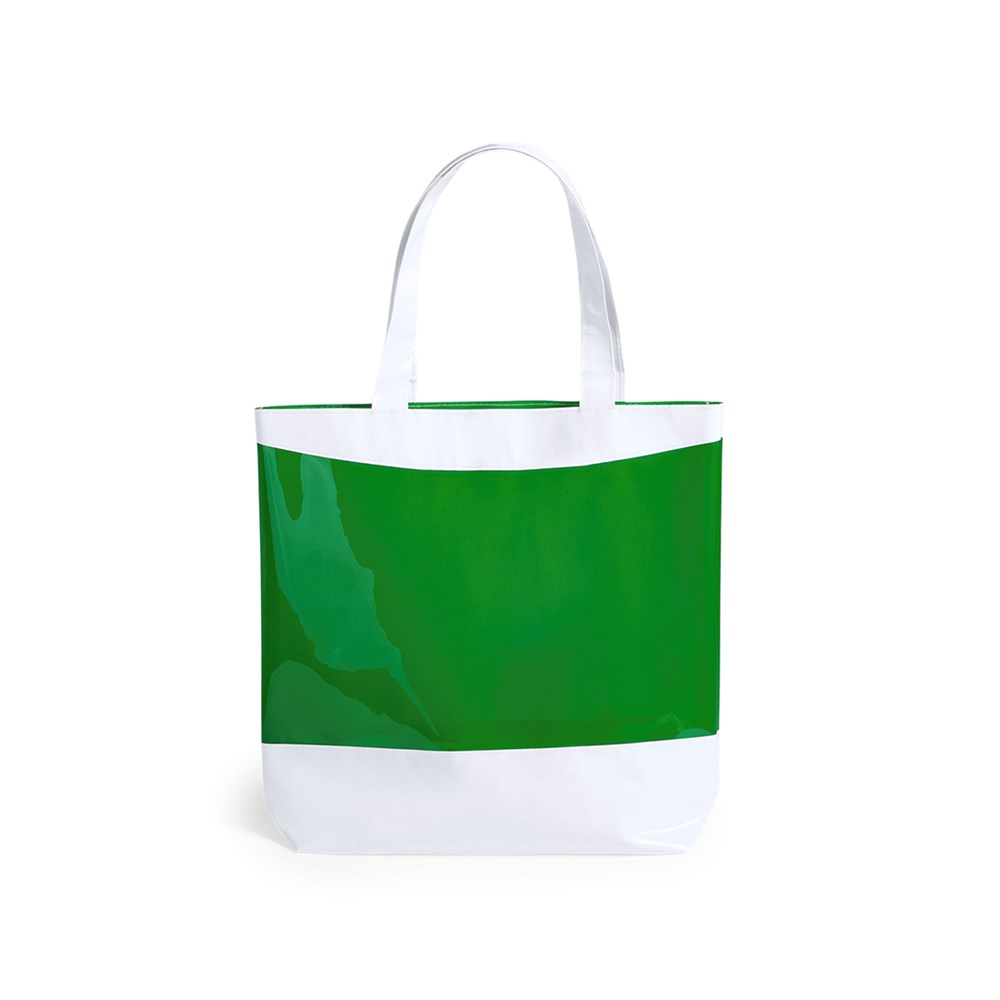 Originelle Tasche aus robustem PVC in kräftigen Farben, mit Boden und Henkeln in Weiß. Mit 41 cm langen Griffen, verstärktem Zwickel und Steppnähten. Belastbar mit bis zu 9 kg.