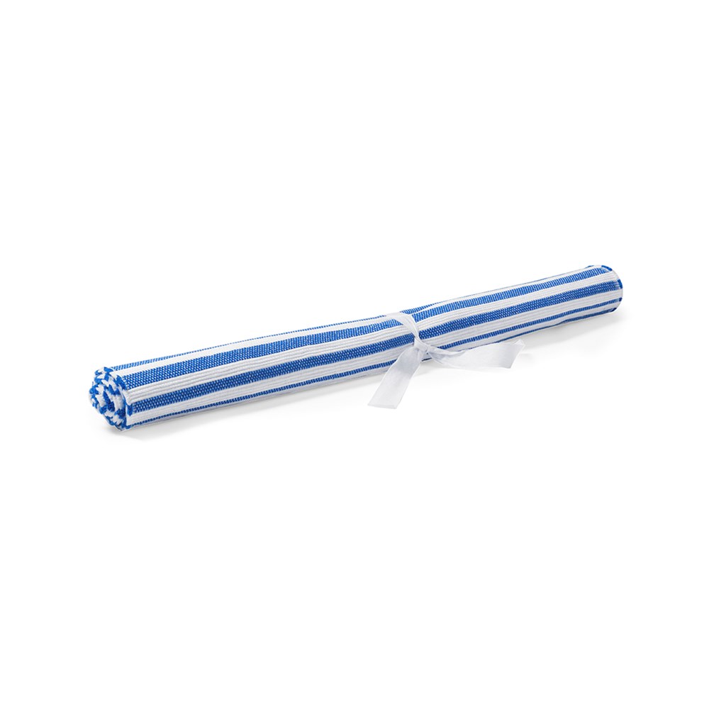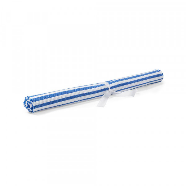 Robuste 180 x 70 cm große Strandmatte aus Polyester mit originellem, zweifarbigem Streifen-Design. Mit Band zum Fixieren im aufgerollten Zustand.